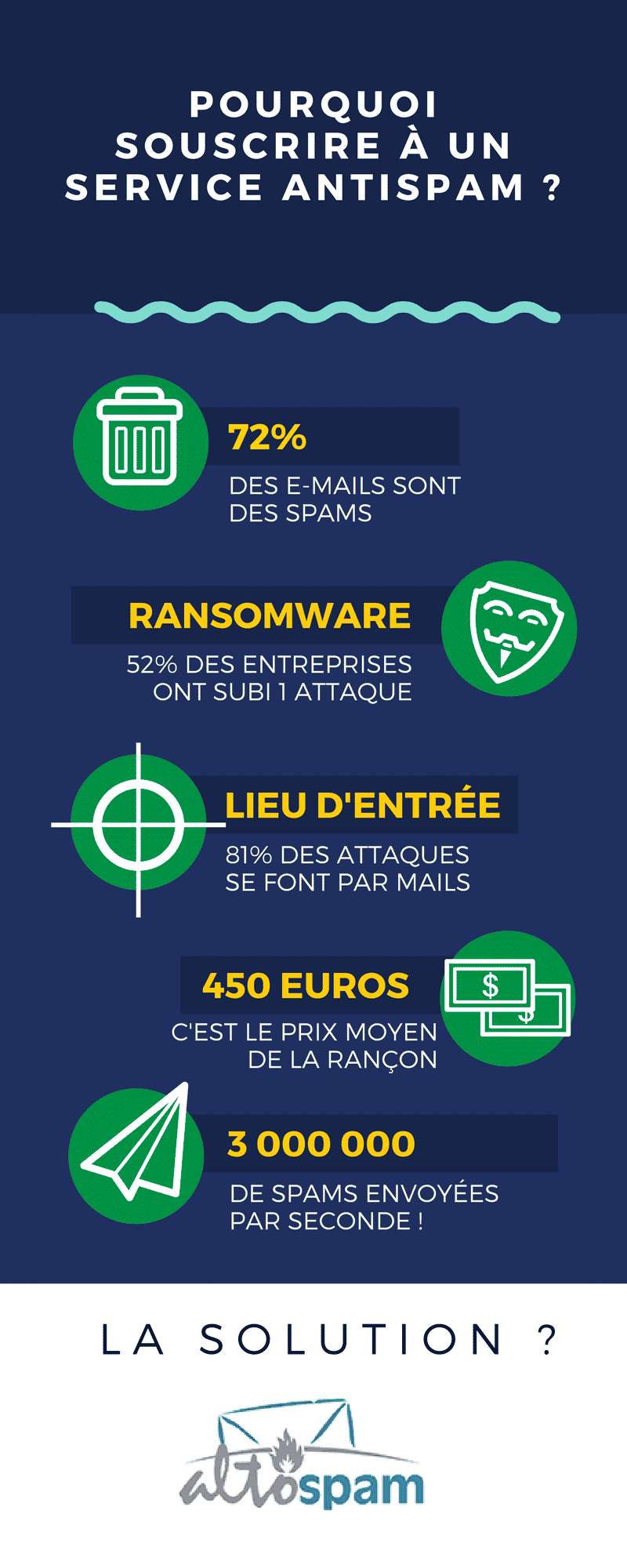 Il est notamment possible de tester gratuitement ces services. Ainsi, vous aurez donc la possibilité de vous faire votre propre avis sur ce service sans aucun engagement. Comme vous le savez, les spams ne remplissent pas seulement nos boîtes mail de messages publicitaires et inutiles. Ils sont également un danger important pour votre sécurité ou bien celle de votre entreprise. De plus, la surcharge de votre messagerie vous fait certainement parfois rater des messages réellement importants qui sont noyés parmi les centaines de mails inutiles et frauduleux. Heureusement pour vous, Altospam permet de résoudre facilement les différents problèmes engendrés par le spam et les ransomwares.