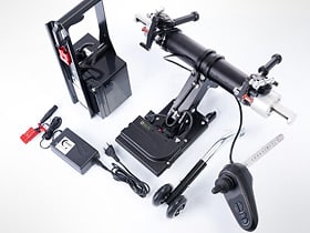 En fait cet équipement, appelé Minotor, transforme le fauteuil manuel en fauteuil électrique en moins d’une minute, il suffit de le clipper sur le fauteuil. Ensuite, il se conduit avec un joystick. Ainsi équipée, la chaise roulante reste facile à manœuvrer et à utiliser et à tout moment, on peut se remettre en roues libres en actionnant une manette de débrayage.