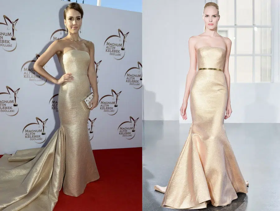 Les détails de la robe Gold de Jessica Alba : coupe, matière et accessoires assortis